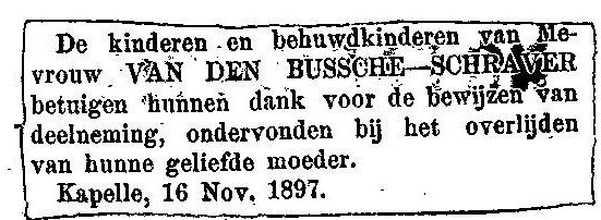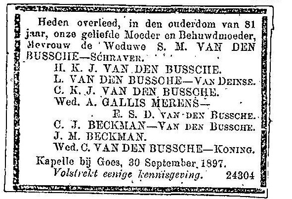 Karel Johannes van den BusscheKarel Johannes van den Bussche  * 17-09-1815 Goes † 09-10-1864 Kortgene ∞ Sara Maria Schraver, 24-10-1842 Goes, 7 kinderen |